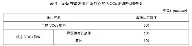 5.5.2泄漏認(rèn)定出現(xiàn)下列情況之一,則認(rèn)定發(fā)生了泄漏:a)密封點(diǎn)存在滲液、滴液等可見的泄漏現(xiàn)象;b)設(shè)備與管線組件密封點(diǎn)的VOCs泄漏檢測值超過表3規(guī)定的VOCs泄漏認(rèn)定濃度。