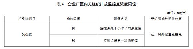 6.2 企業(yè)廠區(qū)內(nèi)無組織排放監(jiān)控點(diǎn)濃度限值應(yīng)執(zhí)行表4規(guī)定的限值。