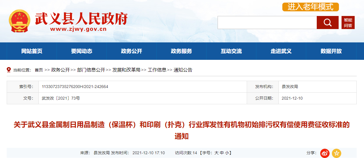 根據(jù)《浙江省排污權(quán)有償使用和交易試點(diǎn)工作暫行辦法》(浙政辦發(fā)〔2010〕132號)、《浙江省初始排污權(quán)有償使用費(fèi)征收標(biāo)準(zhǔn)管理辦法(試行)》(浙價(jià)資〔2011〕176號)、《浙江省生態(tài)環(huán)境廳關(guān)于印發(fā)全省生態(tài)環(huán)境系統(tǒng)2021年度改革工作計(jì)劃>的通知》(浙環(huán)函[2021]75號)和《金華市生態(tài)環(huán)境局、金華市發(fā)展和改革委員會(huì)關(guān)于開展揮發(fā)性有機(jī)物(VOCs)排污權(quán)有償使用和交易試點(diǎn)工作的通知》的規(guī)定,現(xiàn)就我縣金屬制日用品制造(保溫杯)和印刷(撲克)揮發(fā)性有機(jī)物初始排污權(quán)有償使用費(fèi)征收標(biāo)準(zhǔn)通知如下: