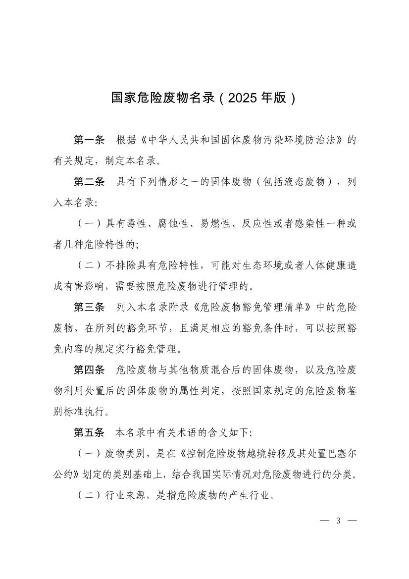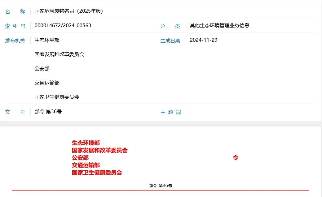《國家危險廢物名錄(2025年版)》已于2024年11月8日由生態(tài)環(huán)境部2024年第5次部務(wù)會議審議通過,并經(jīng)國家發(fā)展改革委、公安部、交通運輸部、國家衛(wèi)生健康委同意,現(xiàn)予公布,自2025年1月1日起施行。