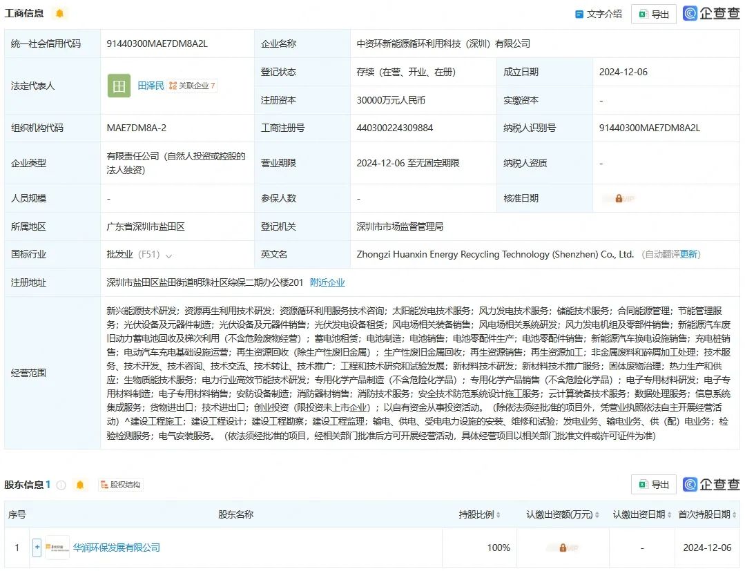 12月6日,中資環(huán)新能源循環(huán)利用科技(深圳)有限公司成立,法定代表人為田澤民,注冊(cè)資本3億人民幣,經(jīng)營(yíng)范圍含新興能源技術(shù)研發(fā)、資源再生利用技術(shù)研發(fā)、資源循環(huán)利用服務(wù)技術(shù)咨詢、太陽(yáng)能發(fā)電技術(shù)服務(wù)、風(fēng)力發(fā)電技術(shù)服務(wù)、儲(chǔ)能技術(shù)服務(wù)、新能源汽車廢舊動(dòng)力蓄電池回收及梯次利用等,由華潤(rùn)環(huán)保發(fā)展有限公司全資持股。