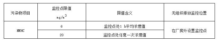 6、廠區(qū)內(nèi)VOCs無組織排放限值,監(jiān)控點處1 h平均濃度值不高于6,監(jiān)控點處任意一次濃度值不高于20;