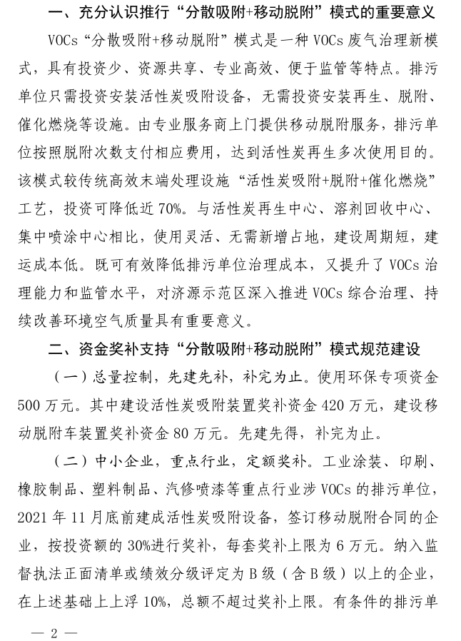 2. 中小企業(yè),重點(diǎn)行業(yè),定額獎補(bǔ)。工業(yè)涂裝、印刷、橡膠制品、塑料制品、汽修噴漆等重點(diǎn)行業(yè)涉VOCs的排污單位2021年11月底前建成活性炭吸附設(shè)備,簽訂移動脫附合同的企業(yè),按投資額的30%進(jìn)行獎補(bǔ),每套獎補(bǔ)上限為6萬元。納入監(jiān)督執(zhí)法正面清單或績效分級評定為B級(含B級)以上的企業(yè),在上述基礎(chǔ)上上浮10%,總額不超過獎補(bǔ)上限。有條件的排污單位投資移動脫附車,與其他排污單位簽訂服務(wù)合同的單位,按脫附車投資額的40%進(jìn)行獎補(bǔ),獎補(bǔ)上限為20萬元。