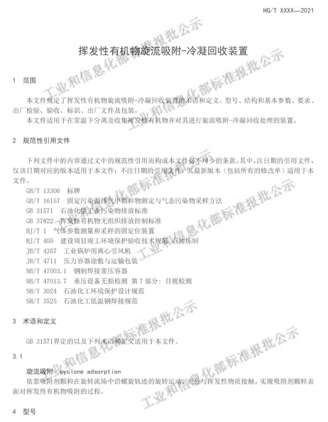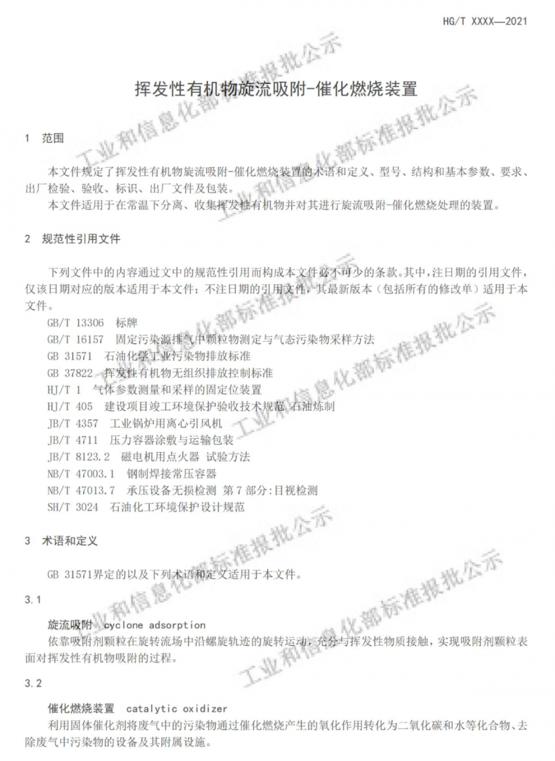 日前,工業(yè)和信息化部對一批行業(yè)標(biāo)準(zhǔn)進(jìn)行報批公示,其中包括《揮發(fā)性有機(jī)物旋流吸附-催化燃燒裝置》HG/T 5998-2022和《揮發(fā)性有機(jī)物旋流吸附-冷凝回收裝置》HG/T 5999-2022這兩項行業(yè)標(biāo)準(zhǔn)。