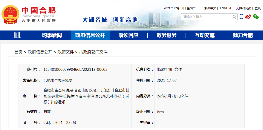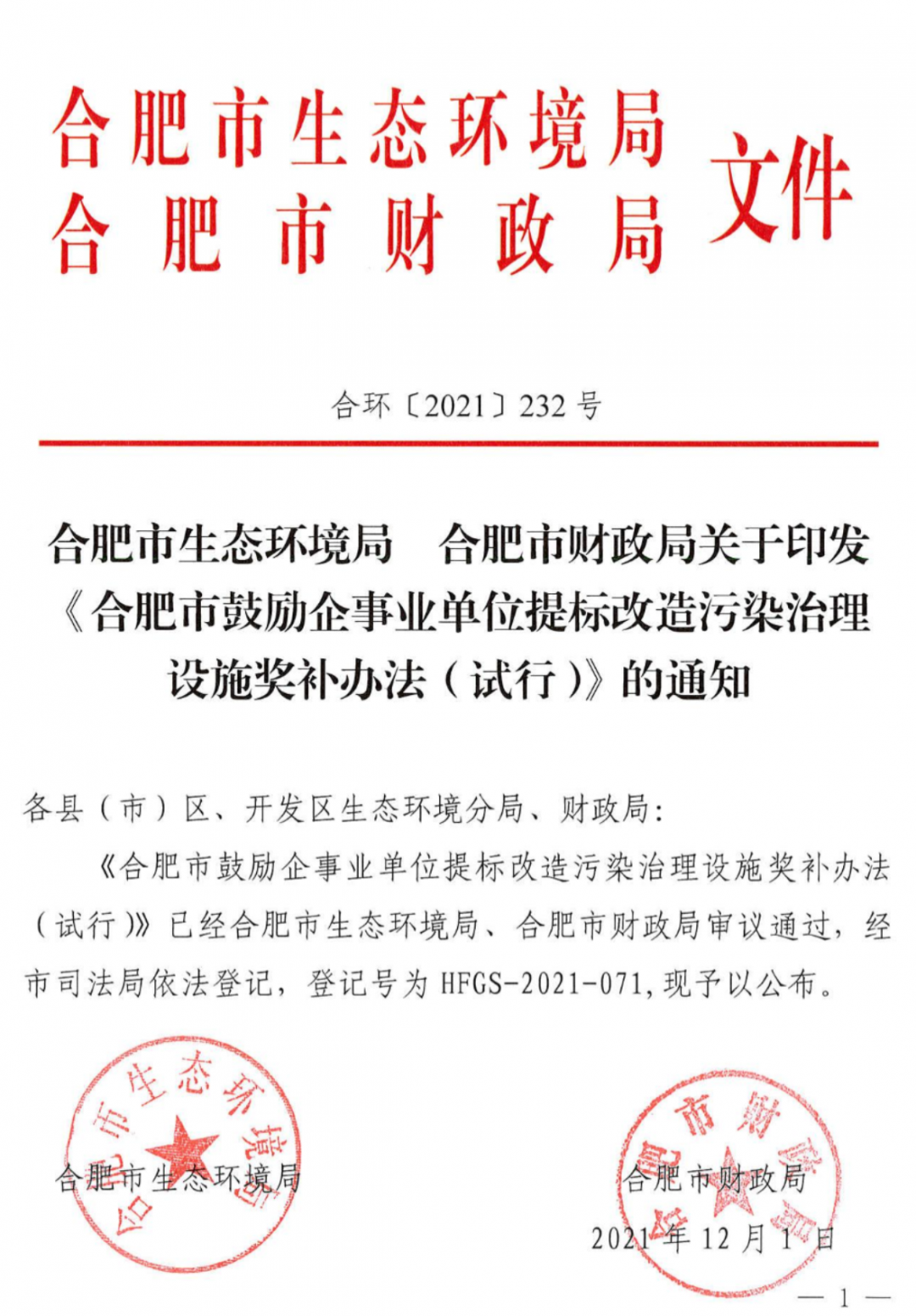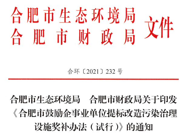 為鼓勵企事業(yè)單位加大環(huán)保投入力度,加快推進(jìn)污染治理設(shè)施提標(biāo)改造,強(qiáng)化源頭治理,進(jìn)一步減少污染物排放,近日,合肥市生態(tài)環(huán)境局和合肥市財(cái)政局印發(fā)《合肥市鼓勵企事業(yè)單位提標(biāo)改造污染治理設(shè)施獎補(bǔ)辦法(試行)》。詳細(xì)內(nèi)容請見下方。