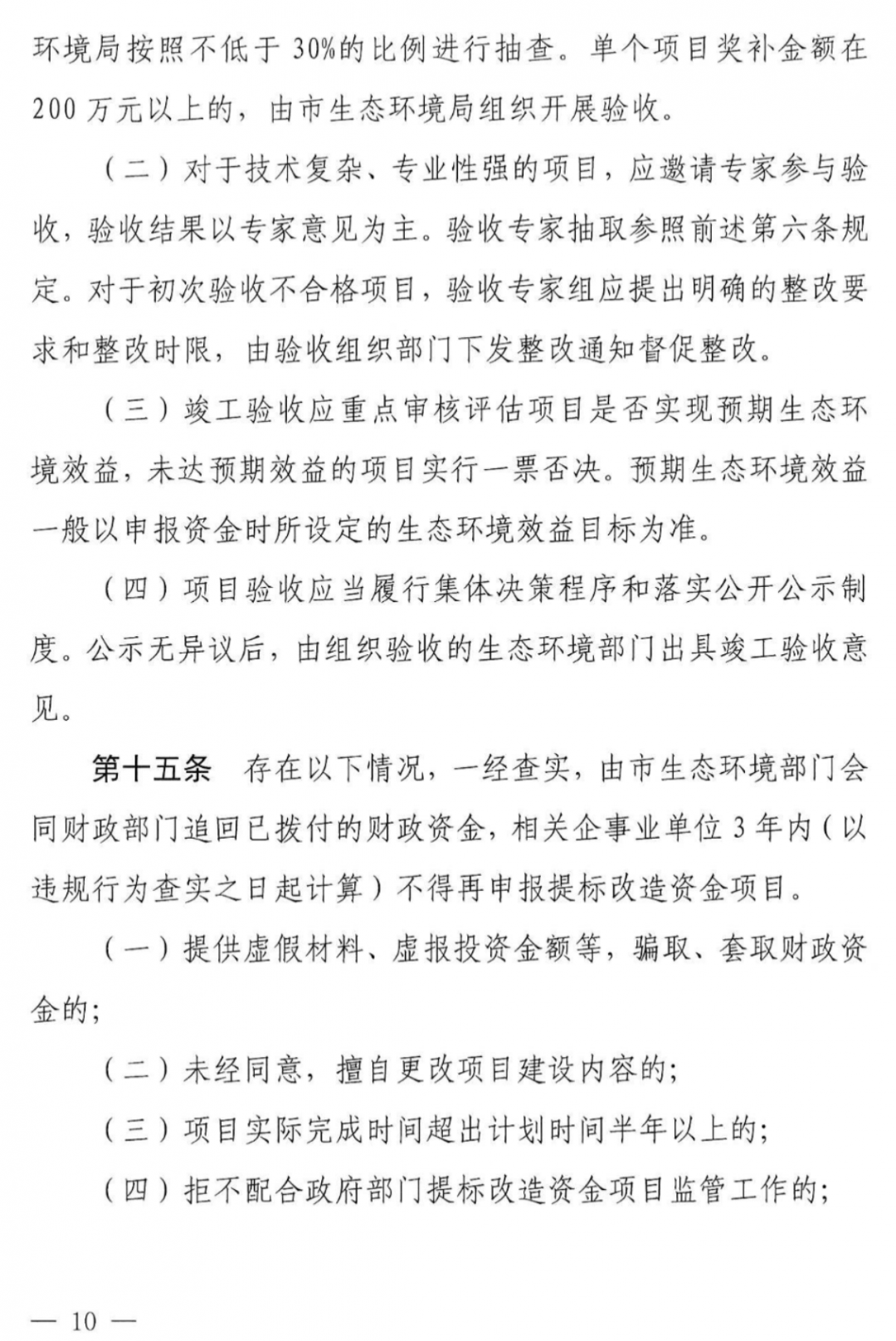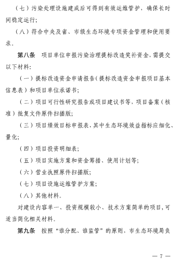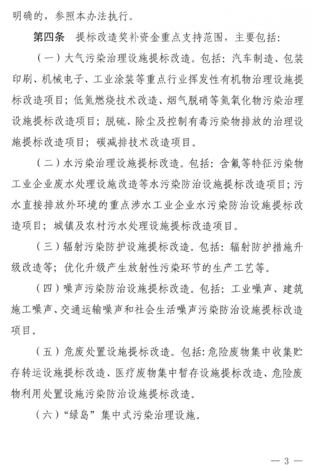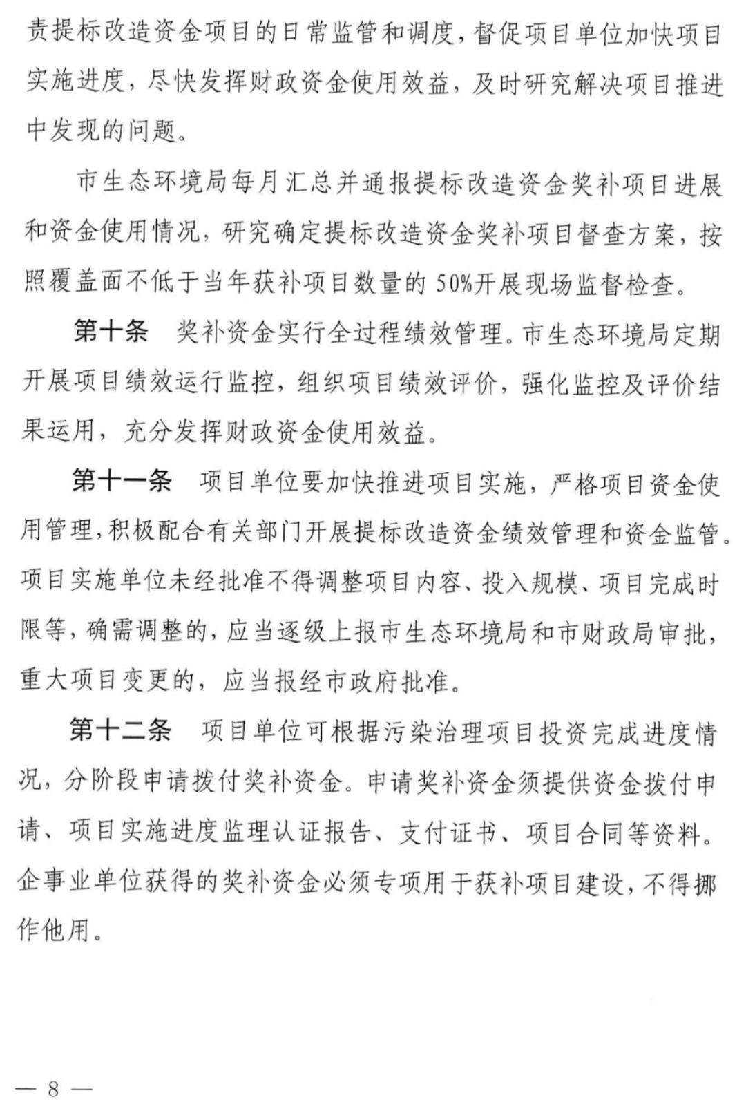 本辦法所稱“提標(biāo)改造”項(xiàng)目是指企事業(yè)單位在達(dá)標(biāo)排放或已達(dá)到當(dāng)?shù)丨h(huán)境監(jiān)管要求的基礎(chǔ)上自愿實(shí)施的污染防治設(shè)施提標(biāo)改造項(xiàng)目。市生態(tài)環(huán)境局會同市財(cái)政局對符合本辦法支持條件的企事業(yè)單位污染治理提標(biāo)改造項(xiàng)目給予一定額度資金獎補(bǔ)。