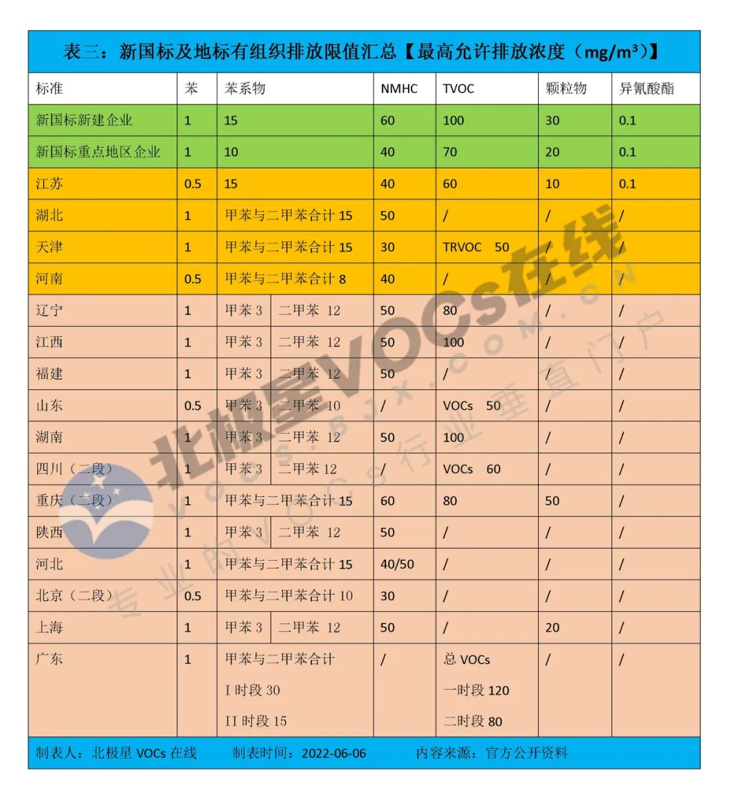 北極星VOCs在線匯總了新國標(biāo)及各省市地標(biāo)中大氣污染物的類別及相應(yīng)最高允許排放濃度的限值(備注:有組織排放控制要求)。詳見表三。