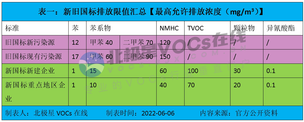 北極星VOCs在線匯總了新舊國標(biāo)大氣污染物最高允許排放濃度的限值,與舊國標(biāo)相比,新國標(biāo)污染物項(xiàng)目范圍廣、細(xì)分化明顯,不論是苯、苯系物還是NMHC均處于更低水平,限值更為嚴(yán)格。詳見表一所示。