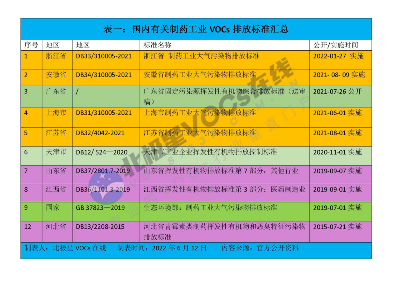北極星VOCs在線匯總了現(xiàn)行制藥工業(yè)相關揮發(fā)性有機物(VOCs)排放標準(若有疏漏,敬請諒解),見表一所示。