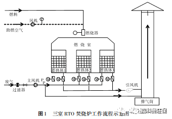 RTO( Regenerative Thermal Oxidation), 即蓄熱式熱氧化, 是一種配有蓄熱床層的熱力燃燒方式。蓄熱燃燒系統(tǒng)主要由燃燒裝置、蓄熱室(內(nèi)有蓄熱體)、換向系統(tǒng)、排煙系統(tǒng)和連接管道五部分組成。