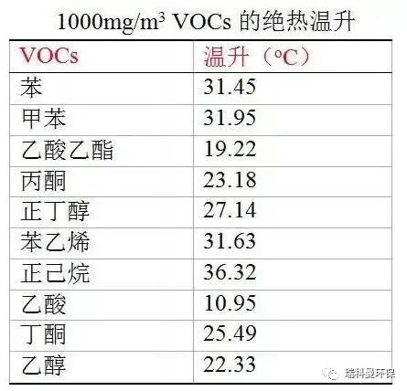 VOCs的燃燒過程是強放熱反應,因放熱使得氣體溫度的升高。下表是幾種常見VOCs濃度1000mg/m3時完全燃燒的絕熱溫升。