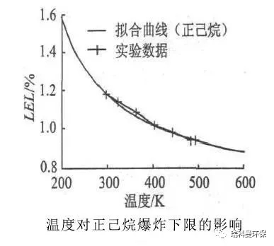 為什么要控制在25%LEL以下呢?首先,可燃氣體的爆炸下限濃度與可燃氣體的初始溫度有關(guān):以正己烷為例,下圖是溫度對于正己烷爆炸下限濃度的影響(姚潔等,工業(yè)安全與環(huán)保,2012,38(2):48),可見當可燃氣體初始溫度提高,相應爆炸下限濃度下降。