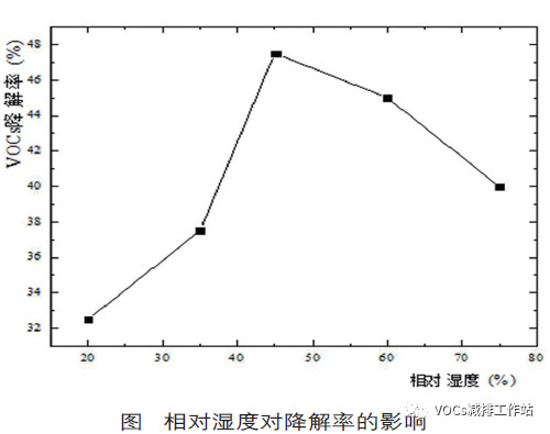 從上圖的數(shù)據(jù)可以看到,隨著濕度增大,在濕度50% 時,降解率升到一個極點。但隨著濕度增大,降解率又開始下降。所以光催化氧化法不是越干燥越好,也不是濕度越高就越好。UV 光生成的臭氧,需要與部分水汽反應生成氫氧自由基或負氧離子增強介質(zhì)的反應活性才可能增大與VOCs 的反應幾率。總之,單獨的紫外光解技術的弊端是,受催化劑、濕度、灰塵顆粒物的影響,紫外燈大部份能量用于產(chǎn)生臭氧,短時間光解VOCs 做不到徹底,反而產(chǎn)生更復雜的中間副產(chǎn)物,造成二次污染,此外,如果采用市面上的二氧化鈦材料,不是銳鈦礦型二氧化鈦光觸媒,完全沒有催化光解功效。