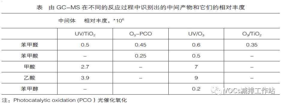 目前普遍研究認為光催化氧化法能夠將VOCs 完全降解生成無毒無害的CO2 和H2O等,但是在實際工程實踐中VOCs 的光催化氧化反應會生成酮、醛等中間產(chǎn)物,對環(huán)境造成二次污染。如下表所示實驗結果。