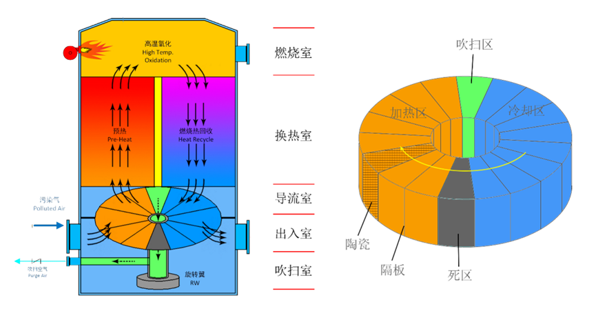 旋轉(zhuǎn)式RTO出現(xiàn)在20世紀(jì)90年代末,是RTO發(fā)展的第三代技術(shù)。通過(guò)旋轉(zhuǎn)閥 (蓄熱筒) 旋轉(zhuǎn)、分度、廢氣均布等動(dòng)作,順序地引導(dǎo)廢氣進(jìn)入或排出燃燒室的特定部分。通過(guò)在轉(zhuǎn)子表面設(shè)置的密封裝置,將轉(zhuǎn)子分成入口和出口兩部分,通過(guò)這兩部分分別將處理前的廢氣和凈化后氣體引入或排出 RTO 燃燒室。目前旋轉(zhuǎn)式RTO的發(fā)展過(guò)程中在其旋轉(zhuǎn)閥的運(yùn)行方式,吹掃的方式、密封方式以及蓄熱室的分區(qū)都有不一樣的設(shè)計(jì),因此也衍生出不同的類型的RTO。