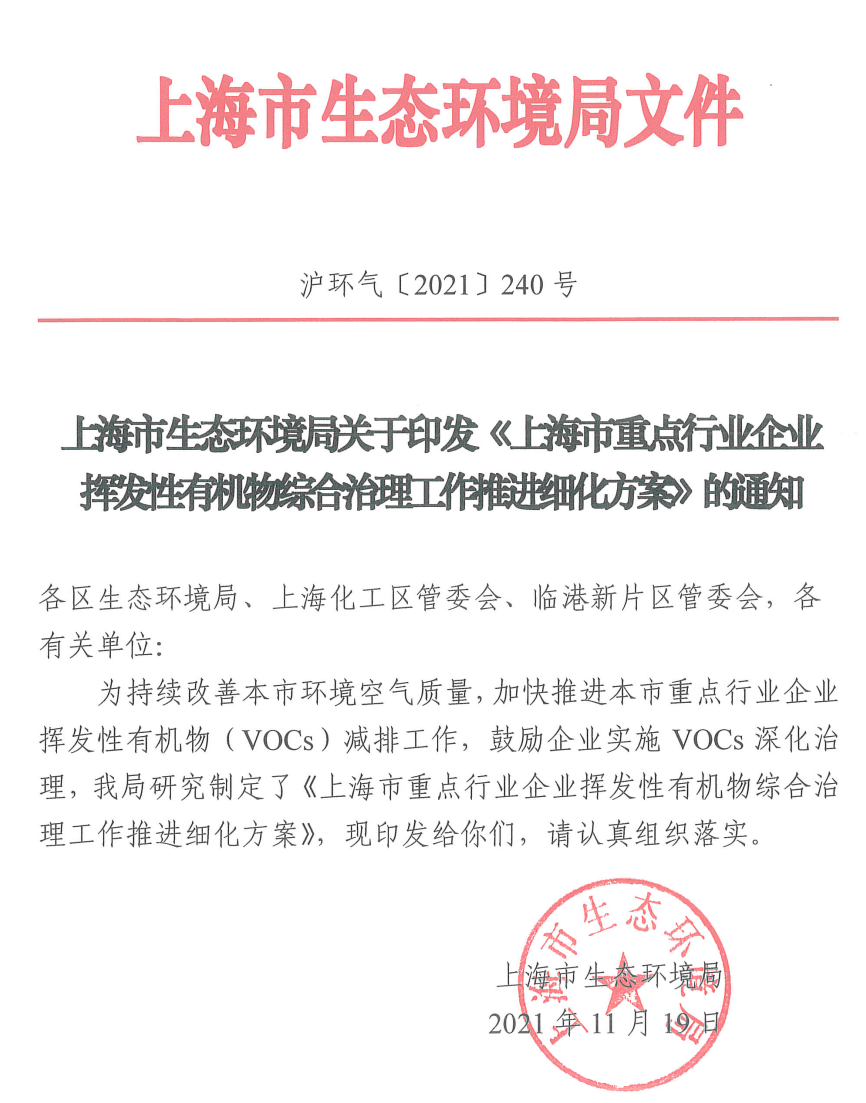 上海市生態(tài)環(huán)境局關(guān)于印發(fā)《上海市重點(diǎn)行業(yè)企業(yè)揮發(fā)性有機(jī)物綜合治理工作推進(jìn)細(xì)化方案》的通知