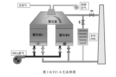 蓄熱式燃燒技術(RTO)主要原理是:揮發(fā)性有機廢氣經(jīng)過預熱室升溫后,進入燃燒室高溫焚燒(升溫到800℃),在富氧的條件下進行徹底的氧化分解,有機物氧化成水和二氧化碳,在經(jīng)過另外一個蓄熱室的蓄熱體存儲熱量,存儲的熱量可以用于下一輪預熱新進入的有機廢氣,經(jīng)過周期性地改變氣流方向從而保持爐膛溫度的穩(wěn)定。RTO 工藝流程圖見圖1。