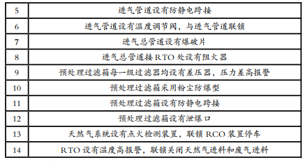 RTO 處理系統(tǒng)爆炸的發(fā)生,需要滿足三要素,即可燃物、助燃物和點火源,所以安全防控措施主要針對以上三要素的防控。