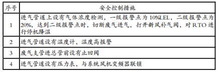 某化工行業(yè)廢氣風量為30000 m3/h,廢氣中含有鹽酸、顆粒物和VOCs,采用堿洗+ 干式過濾+RTO 處理企業(yè)混合廢氣,RTO 為三室RTO,VOCs 進氣濃度為1250mg/m3,綜合凈化效率可以達到99%。目前已連續(xù)穩(wěn)定運行5 年,該處理系統(tǒng)的安全控制措施詳見下表。