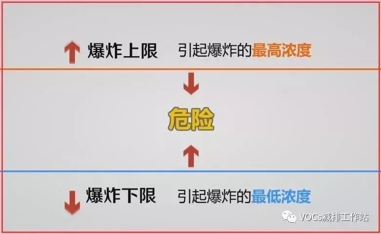 例如常見(jiàn)的VOC:苯,其與空氣混合的爆炸極限為1.5%~9.5%,前后兩個(gè)數(shù)字分別稱為爆炸下限和爆炸上限,這兩者有時(shí)亦稱為著火下限和著火上限。在低于爆炸下限時(shí)不爆炸也不著火;在高于爆炸上限時(shí)不會(huì)爆炸,但能燃燒。這是由于前者的可燃物濃度不夠,過(guò)量空氣的冷卻作用,阻止了火焰的蔓延;而后者則是空氣不足,導(dǎo)致火焰不能蔓延的緣故。