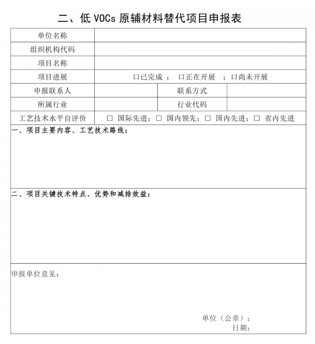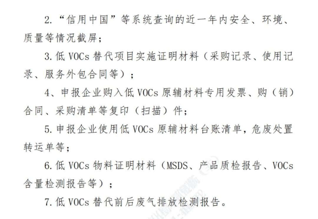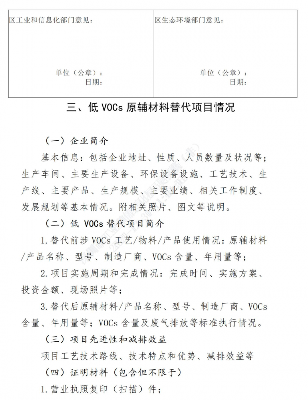 企業(yè)根據(jù)要求自行核算所用低VOCs原輔材料替代比例,達到行業(yè)替代比例要求的,提供低VOCs原輔材料替代報告(附件2,一式三份,含電子版)報轄區(qū)工業(yè)和信息化部門、生態(tài)環(huán)境部門復核初審;書面承諾使用與檢測報告所檢測的原輔料一致,若原輔材料有變動,企業(yè)須重新申請認定。