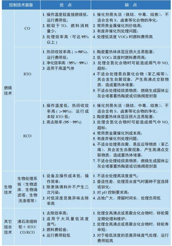實用的VOCs末端治理技術(shù)眾多,主要包括吸附、燃燒(高溫焚燒和催化燃燒)、吸收、冷凝、生物處理及其組合技術(shù)。表 3-1列出了主要控制技術(shù)的優(yōu)缺點。