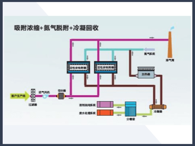 說(shuō)明:此工藝適合中小風(fēng)量,高濃度、成分單一,有回收價(jià)值的揮發(fā)性有機(jī)廢氣;采用此工藝要求企業(yè)有氮?dú)鈦?lái)源,對(duì)于無(wú)蒸汽源企業(yè)可以采用氮?dú)獍l(fā)生器。