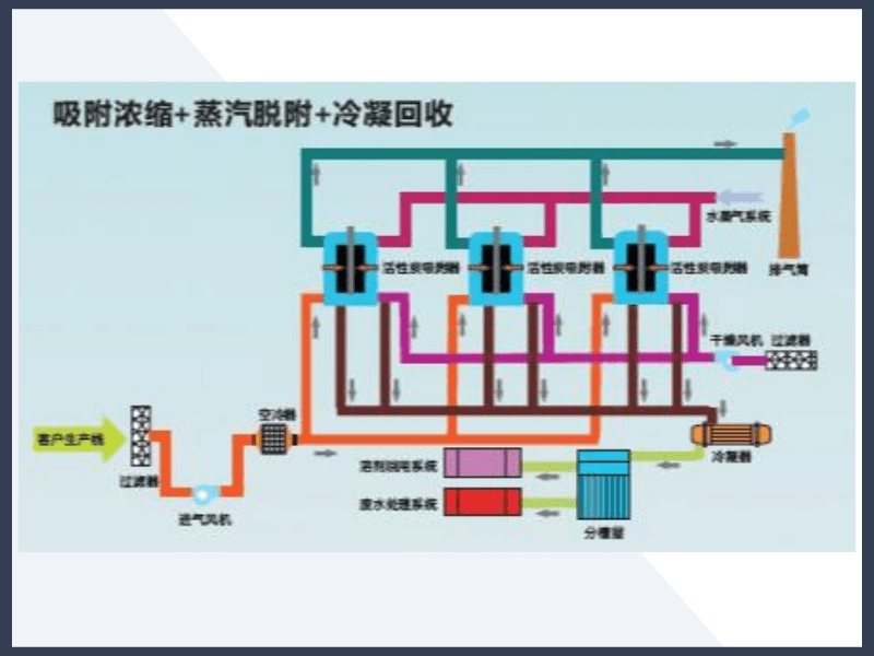 說(shuō)明:此工藝適合中小風(fēng)量、高濃度、成分單一、有回收價(jià)值的揮發(fā)性有機(jī)廢氣;采用此工藝要求企業(yè)有蒸汽來(lái)源,對(duì)于無(wú)蒸汽源企業(yè)可以采用氮?dú)饷摳健?/span>