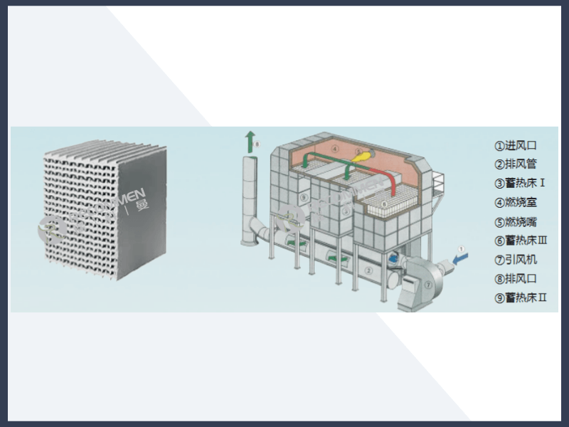 VOCs經(jīng)過預處理后,進入第一個蓄熱室,通過輔助燃燒至反應所需溫度,發(fā)生高溫氧化反應;氧化后的高溫氣體進入第二個蓄熱室,使蓄熱體蓄升蓄熱,氣體經(jīng)過換熱降溫后排至大氣。間隔一定時間后,VOCs進入第二個蓄熱室預熱,通過輔助燃燒至反應所需溫度,發(fā)生高溫氧化反應,氧化后的高溫氣體進入第一個蓄熱室/反應室換熱,使蓄熱體蓄熱,氣體經(jīng)過換熱降溫后排至大氣。第三個蓄熱室作為備用反吹,以提高蓄熱效率,依次循環(huán)。